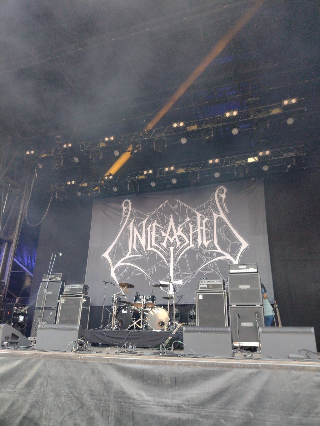Så spurgte jeg mig selv: Hvem kan toppe sådan en koncert? Ja hvem fanden kan overhovedet matche den? Havde jeg der taget et kig på de resterende navne på programmet, så var det ikke Unleashed, som jeg havde regnet med skulle gøre det, for hvem fanden var de egentlig? Det var ikke noget, som jeg havde hørt om før, og da de blev annonceret som et dødsmetal band, så stod det klart for mig hvorfor. Lige med undtagelse af den progressive slags, så har jeg nemlig aldrig haft det helt godt med dødsmetal… I hvert fald når det kommer til plader. Her kommer jeg stort set altid til at kede mig, men til koncerter er det helt anderledes. Man skal nemlig stå tidligt op, hvis man skal overgå et dødsmetal band på scenen, for der er denne form for musik altid så dejligt intens, energisk og dragende. Derfor troppede jeg også op ved scenen, da det jo kunne ske at blive godt, især fordi det netop også var svensk dødsmetal, der jo ofte lige er en tand bedre end alt andet død. Godt blev det dog ikke. Det ville nemlig være en grov fornærmelse bare at kalde det for godt. Nej det var så fucking dejligt pisse hamrende over fantastisk, at jeg med det samme blev trukket så langt foran som jeg kunne komme uden at skulle skubbe, og som tiden gik og et par af de andre forsvandt foran mig, så kom jeg bare længere og længere op indtil jeg endte i den anden forreste række. Det var nemlig bare kanongodt. Dejligt tungt, dejligt voldsomt, leveret af nogle folk på scenen, der virkelig kunne deres kram. Forsangeren og bassisten var godt underholdende, og selvom der på et tidspunkt lige var et par tekniske problemer fra hans side, der skabte en lille pause, så lod han aldrig min opmærksom svinde over til noget andet. Det samme gjaldt også for resten af bandet, for jeg var i hvert fald underholdt hele vejen igennem. De serverede det ene fede nummer efter det andet, og jeh svingende automatisk håret til det, ligesom både djævlehorn og medsang også bare kom fra mig, uden jeg egentlig skulle tænke over det. For mig er det der, hvor musik virkelig giver mening. Når instinkterne bare tager over og giver den hele armen. Her vil jeg så gå tilbage til mit indledende spørgsmål, for overgik Unleashed Artillery, eller matchede de dem bare? Det er selvfølgelig et spørgsmål, som hver enkelt der oplevede begge koncerter kan svare forskelligt på. For mit vedkommende var Unleashed dog de bedste af de to. Ikke meget, men her følte jeg bare noget ekstra. Måske var det fordi, at jeg gik ind til det uden nogen form for viden omkring bandet, hvorefter den positive oplevelse så forstærkede oplevelsen, eller også var det bare mere mig. Uanset hvad, så leverede de dog dagens hidtil bedste oplevelse, og på trods af mit spøjse forhold til dødsmetal i albumformat, så tror jeg da nok lige, at jeg vil sætte en af deres udgivelser på, når jeg engang kommer hjem. Så må vi se, om den rammer på samme måde.